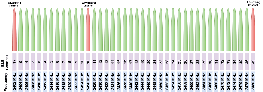 - Uses the 2.402 GHz to 2.480 GHz band. Has 40 channels of 2 MHz each: